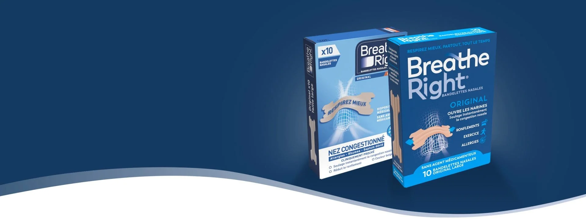 Les bandelettes nasales Breathe Right® sont disponibles en version Petit/Moyen ou Large pour que vous trouviez celles qui vous conviennent le mieux.